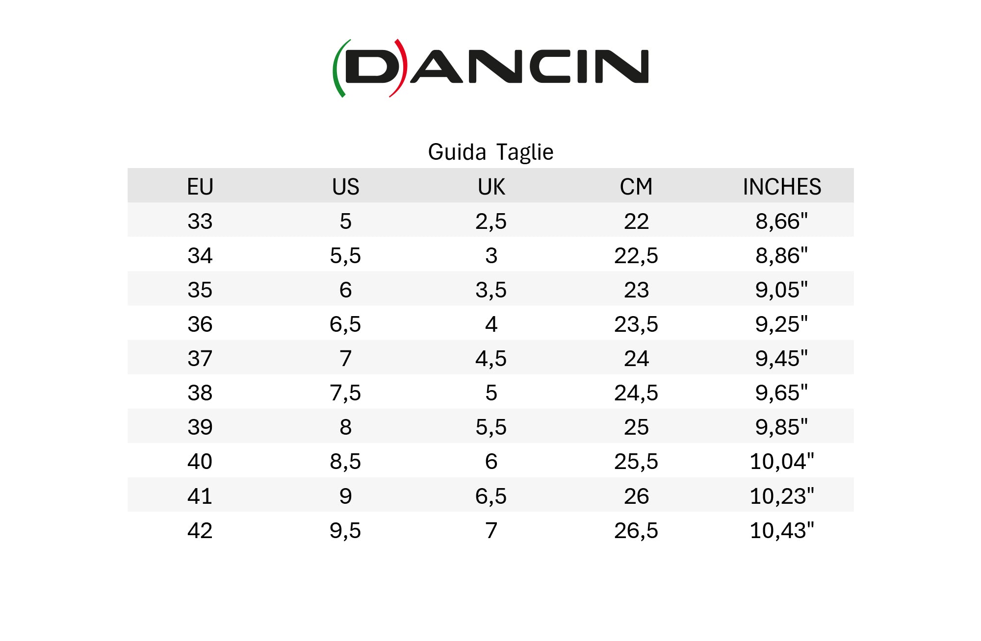 • Sola em camurça, garante um desempenho perfeito, recomendado para superfícies adequadas à dança.
