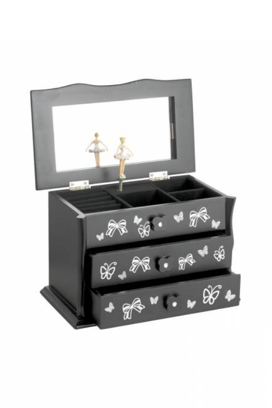 Caixa de música com tampa plana e feita em madeira, contém 3 compartimentos e suporte de anel, desenhado tudo com forro preto.
